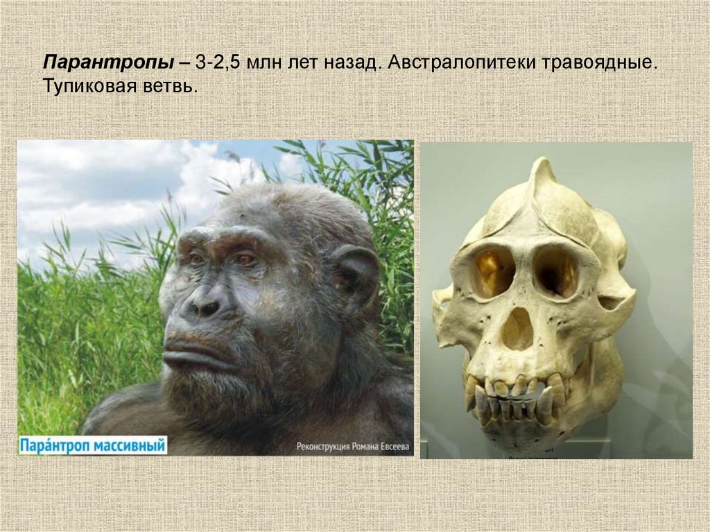 Парантропы – 3-2,5 млн лет назад. Австралопитеки травоядные.Тупиковая ветвь.
