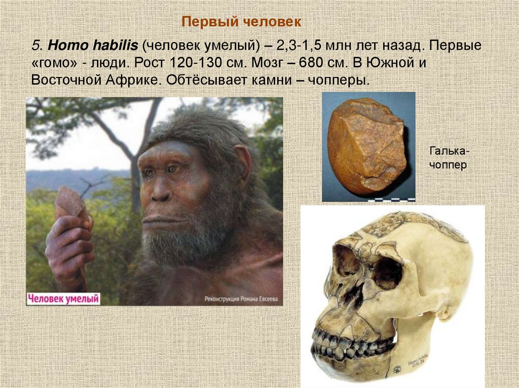 Первый человек5. Homo habilis (человек умелый) – 2,3-1,5 млн лет назад. Первые