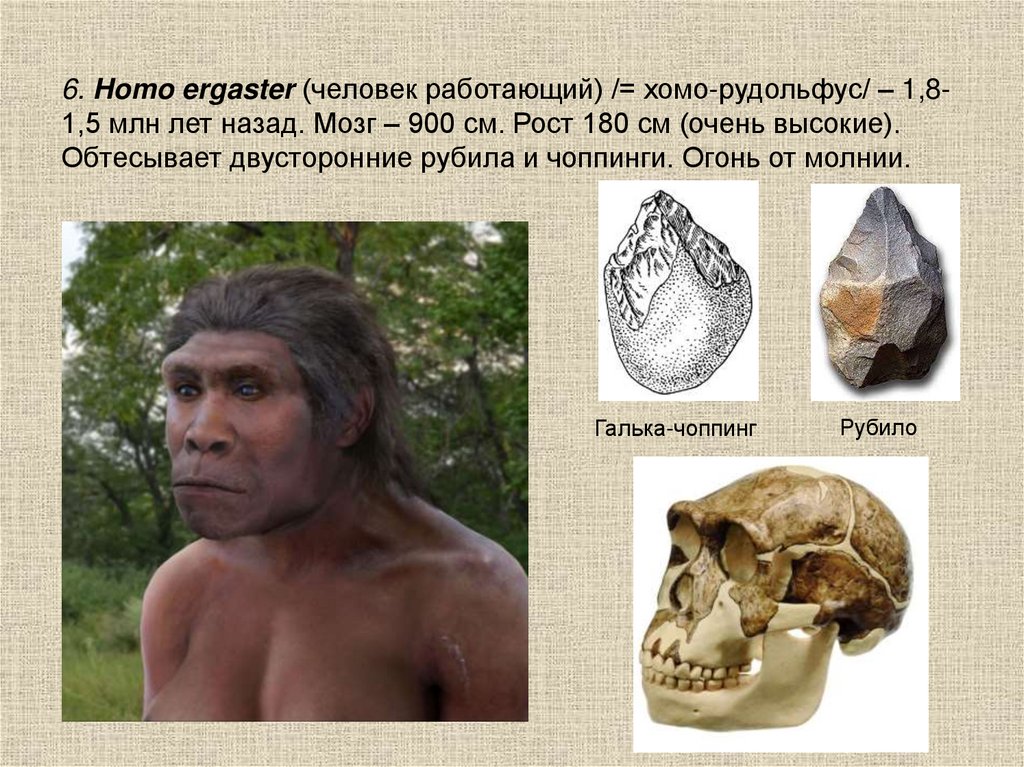 6. Homo ergaster (человек работающий) /= хомо-рудольфус/ – 1,81,5 млн лет назад. Мозг – 900 см. Рост 180 см (очень высокие).Обтесывает двусторонние рубила и чоппинги. Огонь от молнии.