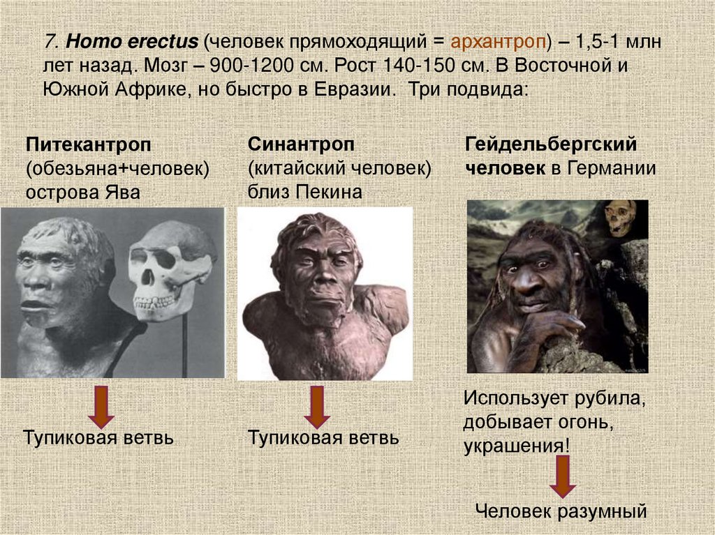 7. Homo erectus (человек прямоходящий = архантроп) – 1,5-1 млнлет назад. Мозг – 900-1200 см. Рост 140-150 см. В Восточной и