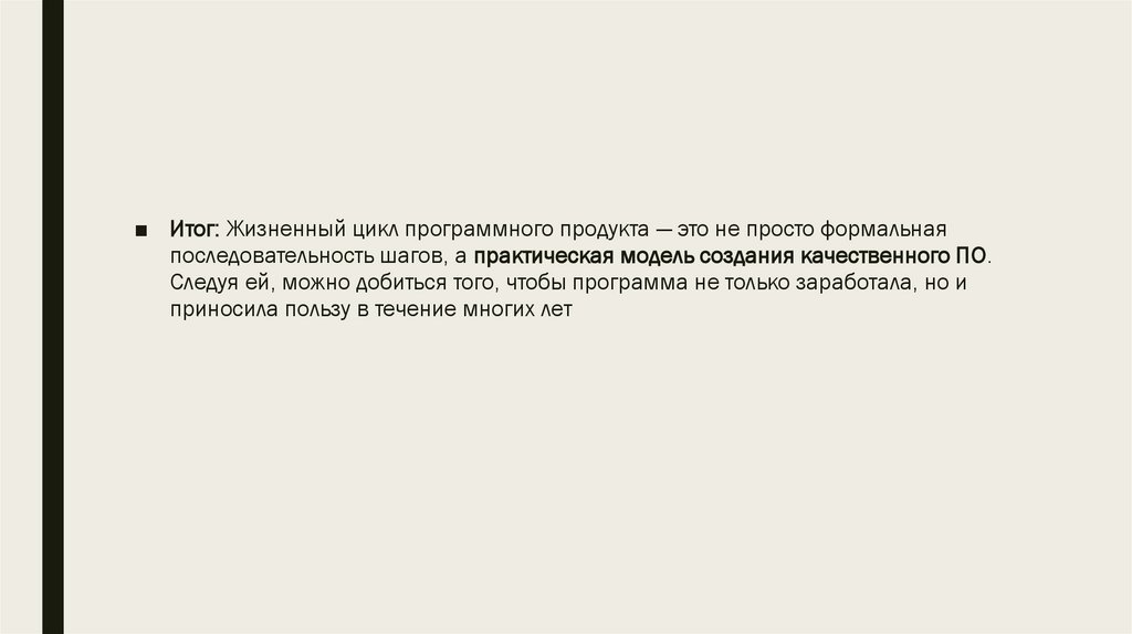 ■ Итог: Жизненный цикл программного продукта — это не просто формальнаяпоследовательность шагов, а практическая модель создания качественного ПО.