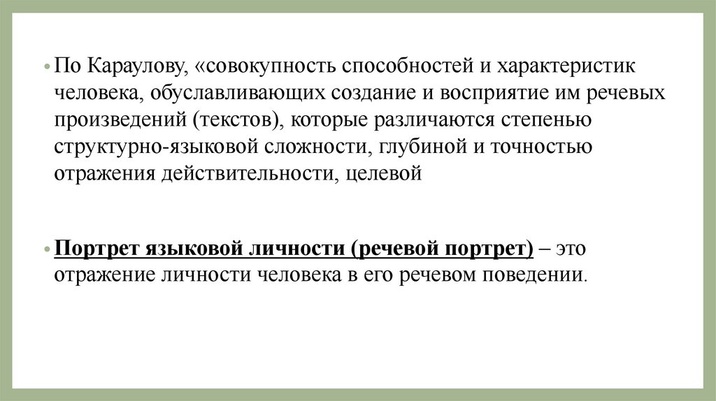 • По Караулову, «совокупность способностей и характеристикчеловека, обуславливающих создание и восприятие им речевых