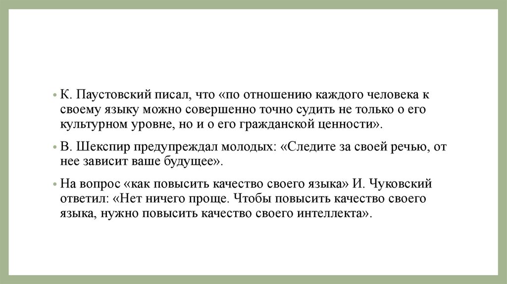 • К. Паустовский писал, что «по отношению каждого человека ксвоему языку можно совершенно точно судить не только о его