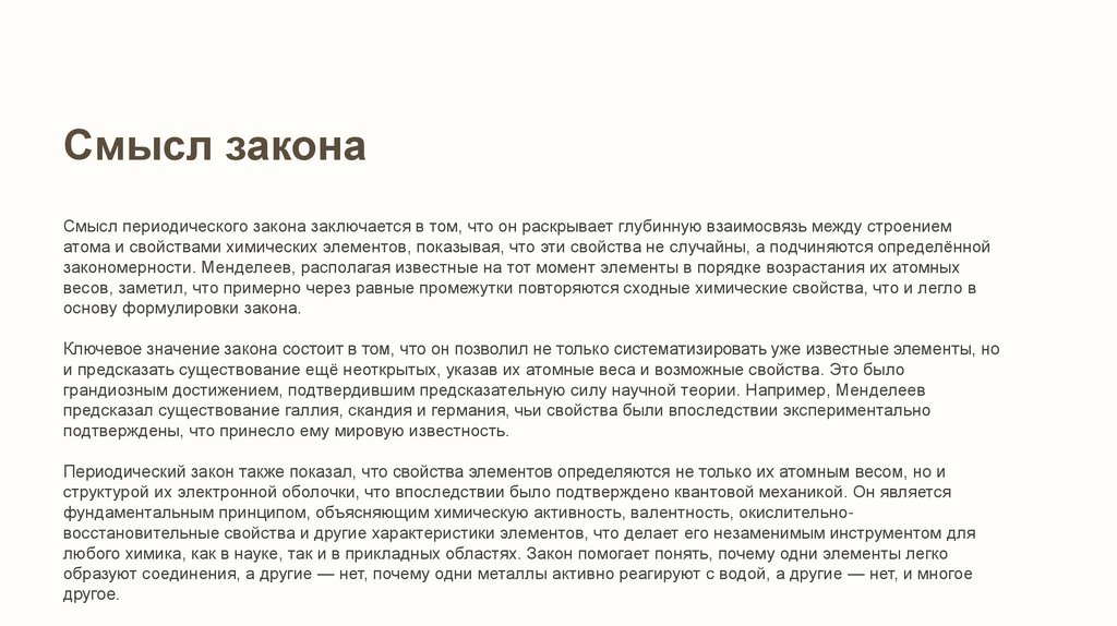 Ключевое значение закона состоит в том, что он позволил не только систематизировать уже известные элементы, но