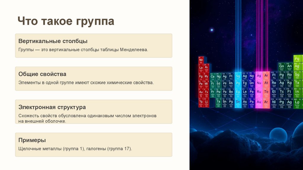 Группы — это вертикальные столбцы таблицы Менделеева.
