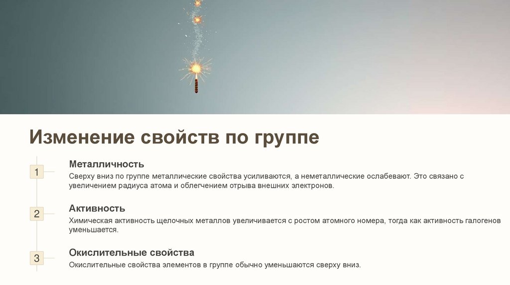 Сверху вниз по группе металлические свойства усиливаются, а неметаллические ослабевают. Это связано с