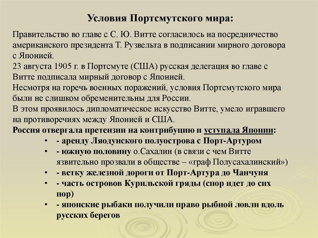 Условия Портсмутского мира:Правительство во главе с С. Ю. Витте согласилось на посредничество