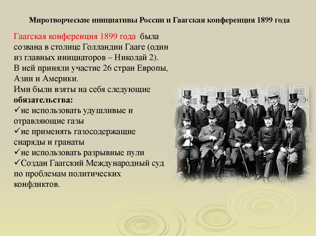 Миротворческие инициативы России и Гаагская конференция 1899 годаГаагская конференция 1899 года была