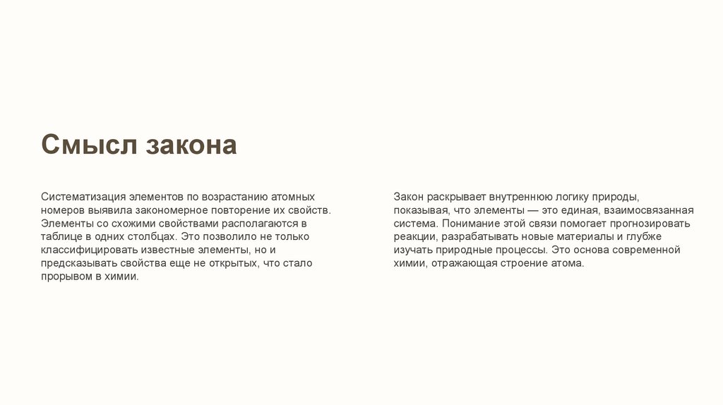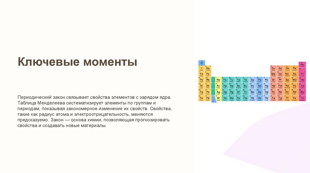 Ключевые моментыПериодический закон связывает свойства элементов с зарядом ядра.