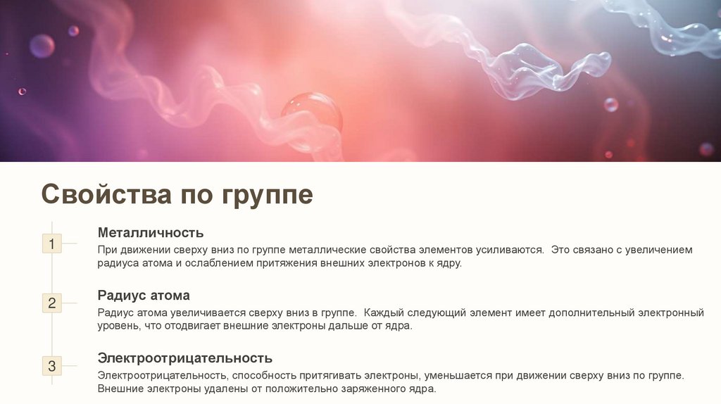 При движении сверху вниз по группе металлические свойства элементов усиливаются. Это связано с увеличением