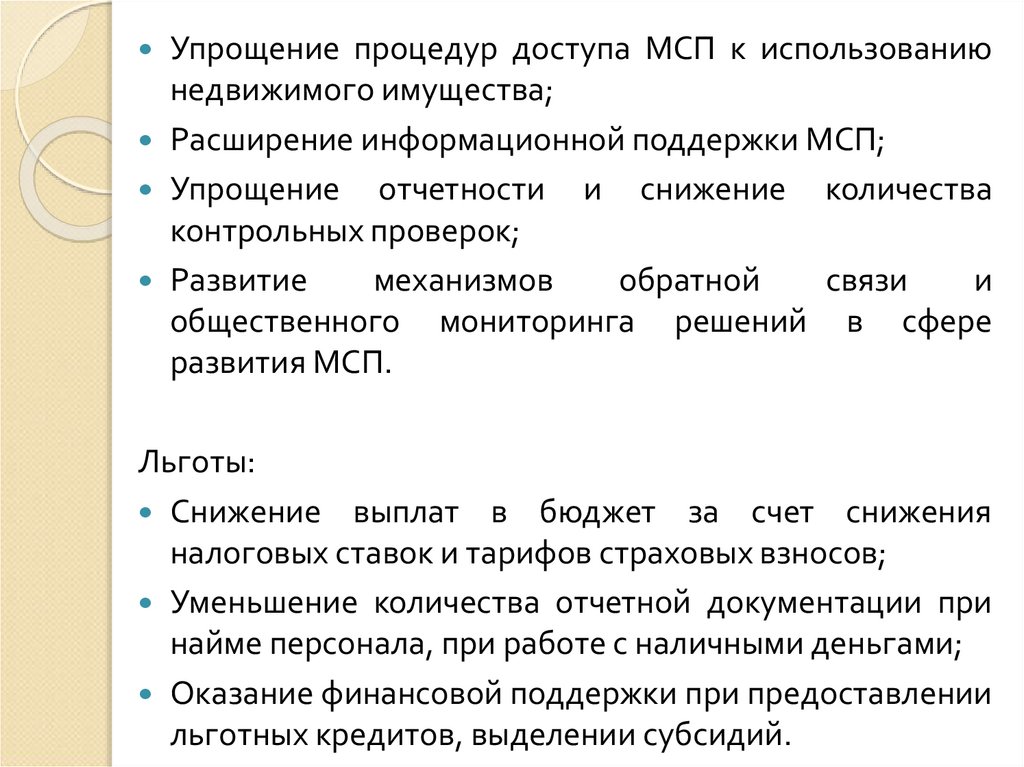 Упрощение процедур доступа МСП к использованиюнедвижимого имущества;