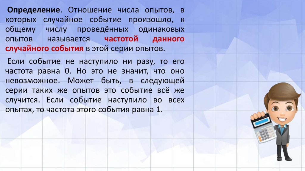 Случайный эксперимент (случайныйопыт) – это условия и обстоятельства,