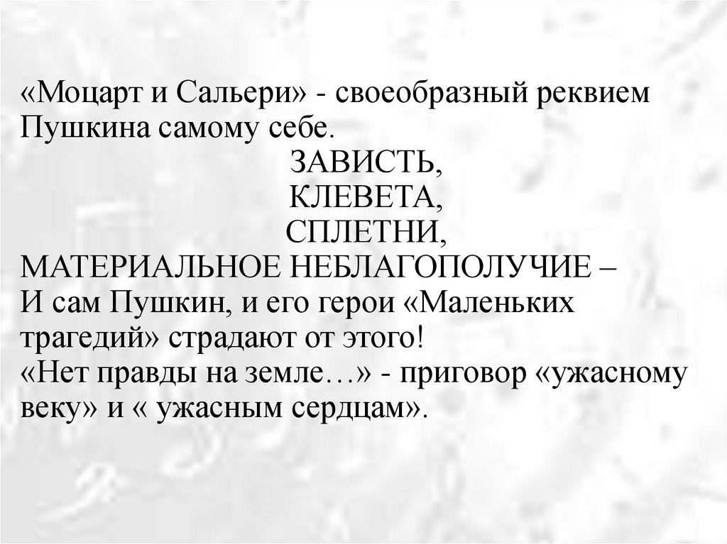 «Моцарт и Сальери» - своеобразный реквиемПушкина самому себе.