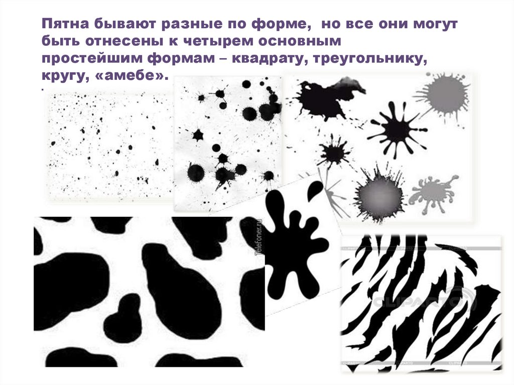 Пятна бывают разные по форме, но все они могутбыть отнесены к четырем основным