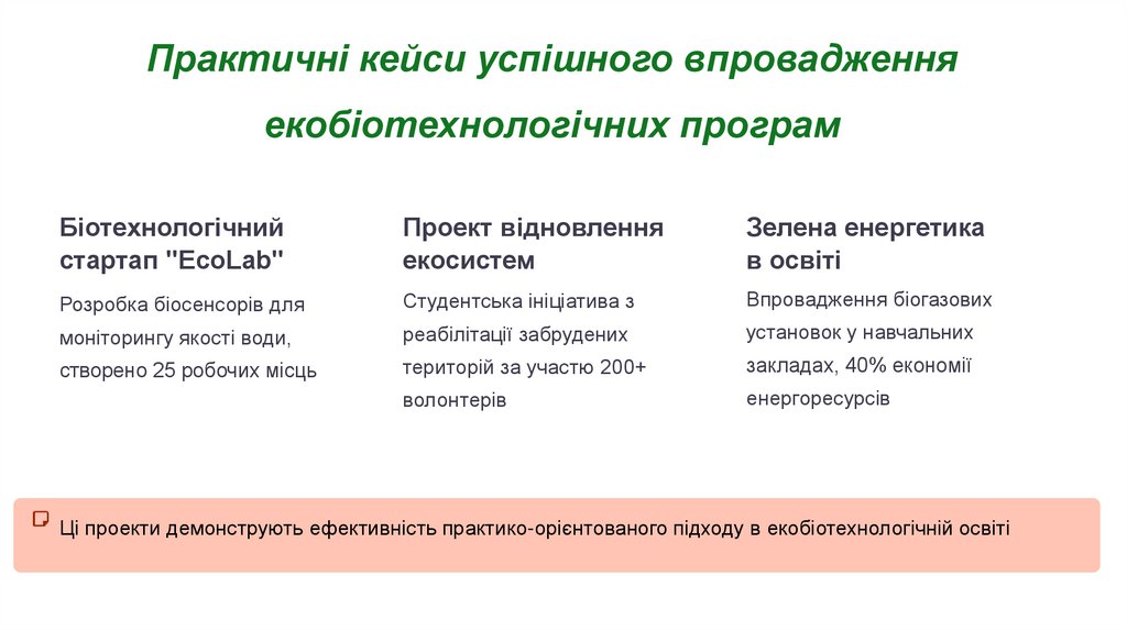 Ці проекти демонструють ефективність практико-орієнтованого підходу в екобіотехнологічній освіті