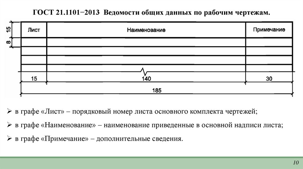 ГОСТ 21.1101−2013 Ведомости общих данных по рабочим чертежам.в графе «Лист» – порядковый номер листа основного комплекта чертежей;