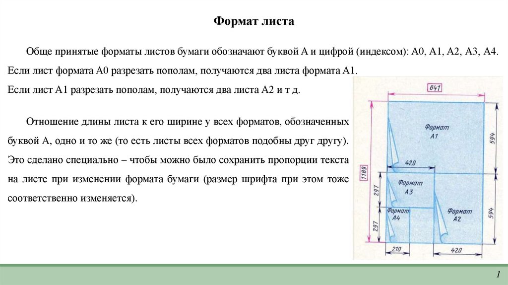 Если лист A1 разрезать пополам, получаются два листа A2 и т д.