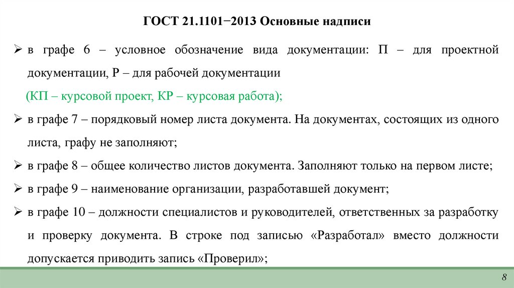 ГОСТ 21.1101−2013 Основные надписив графе 6 – условное обозначение вида документации: П – для проектной