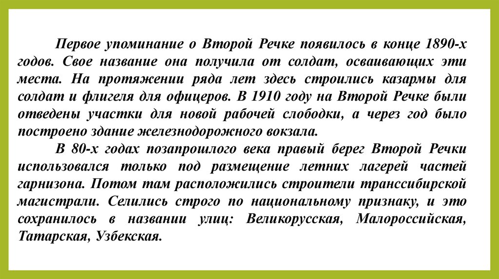Первое упоминание о Второй Речке появилось в конце 1890-хгодов. Свое название она получила от солдат, осваивающих эти