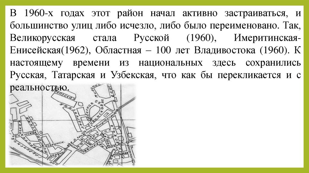 В 1960-х годах этот район начал активно застраиваться, ибольшинство улиц либо исчезло, либо было переименовано. Так,
