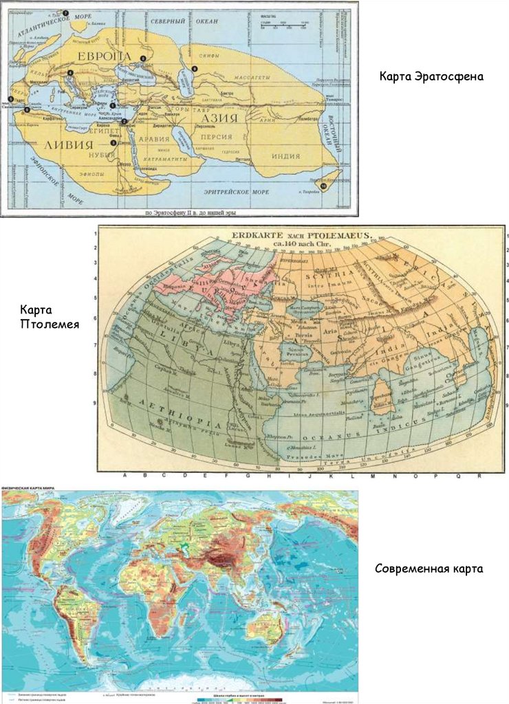 Задание 1. Сравни карты Эратосфена, Птолемея и современную карту мира,