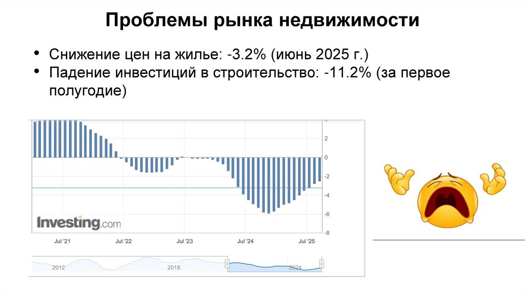 Проблемы рынка недвижимости• Снижение цен на жилье: -3.2% (июнь 2025 г.)