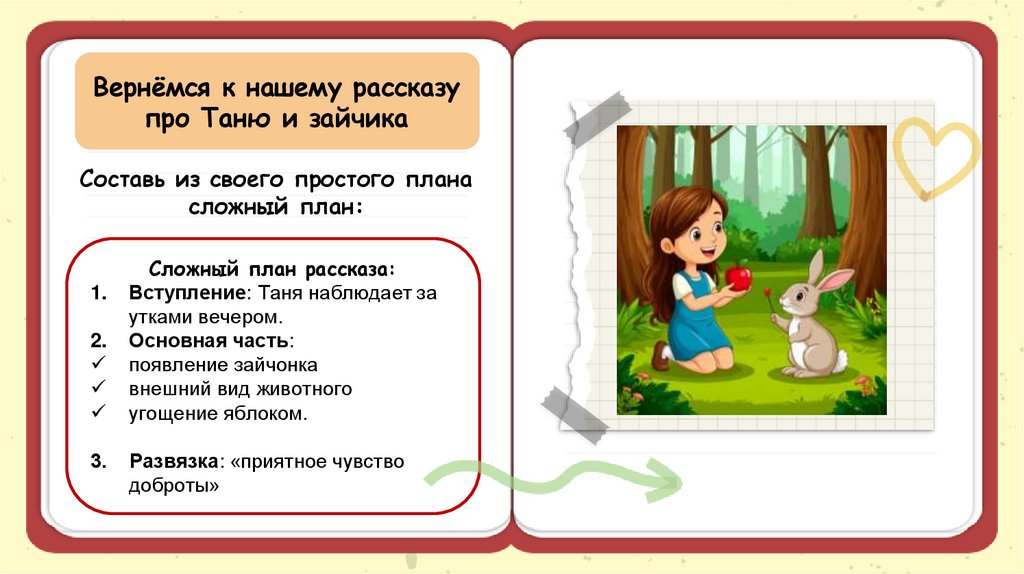 6. Проверь, что у тебя получилось: План: 1. Таня наблюдает за утками. 2. Маленький зайчонок. 3. Чувство радости. Что мы только