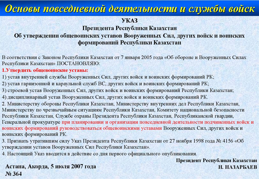 - Общевоинские уставы ВС РК, основные положения законодательства по