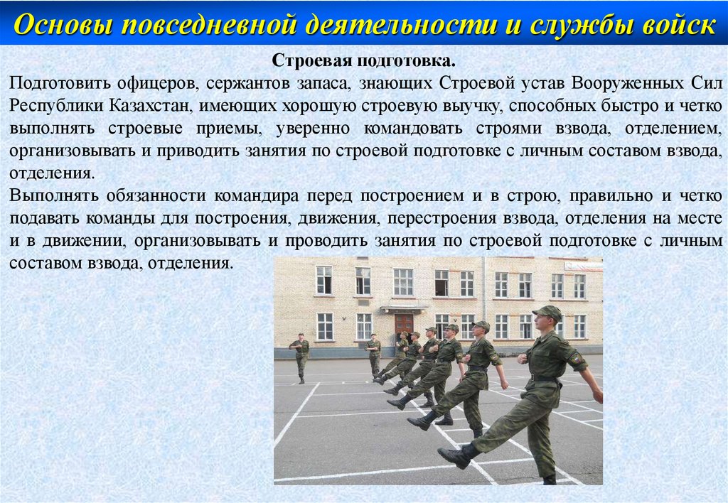 организовывать и приводить занятия по строевой подготовке с личным составом взвода,