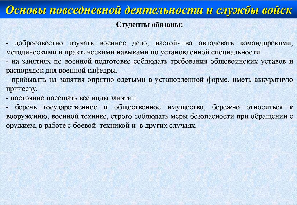 Основы повседневной деятельности и службы войскСтуденты обязаны: