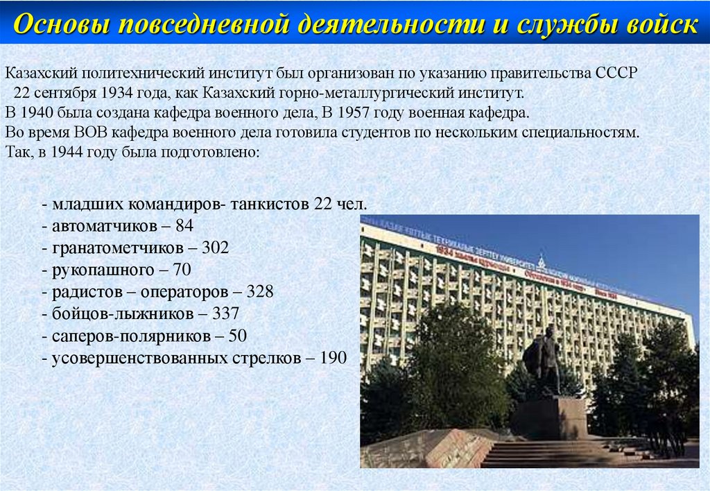 Основы повседневной деятельности и службы войскКазахский политехнический институт был организован по указанию правительства СССР