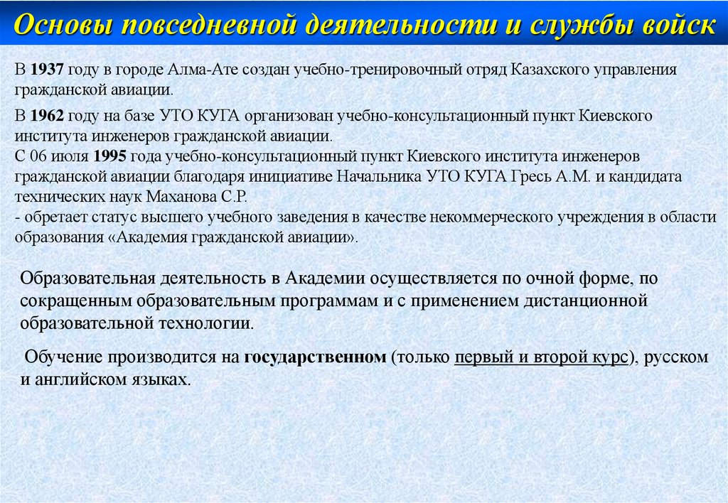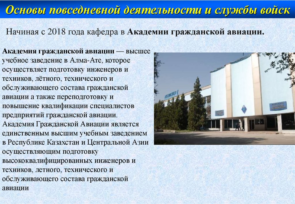 Основы повседневной деятельности и службы войскНачиная с 2018 года кафедра в Академии гражданской авиации.