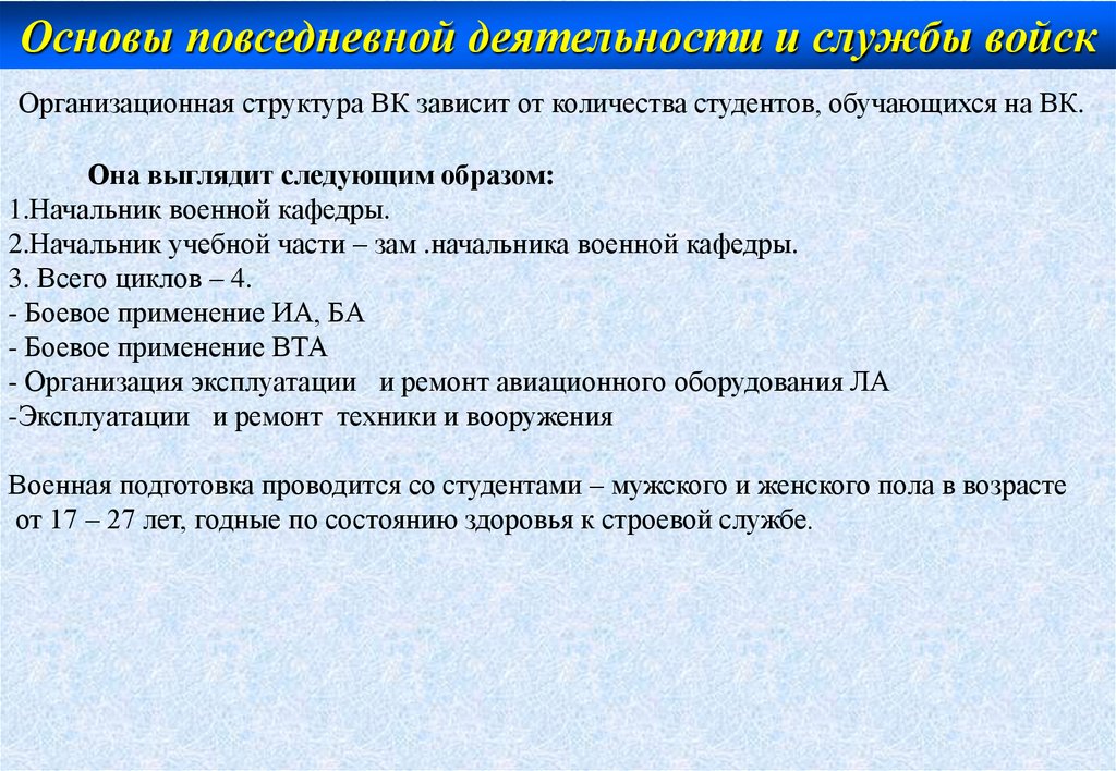 Основы повседневной деятельности и службы войскОрганизационная структура ВК зависит от количества студентов, обучающихся на ВК.