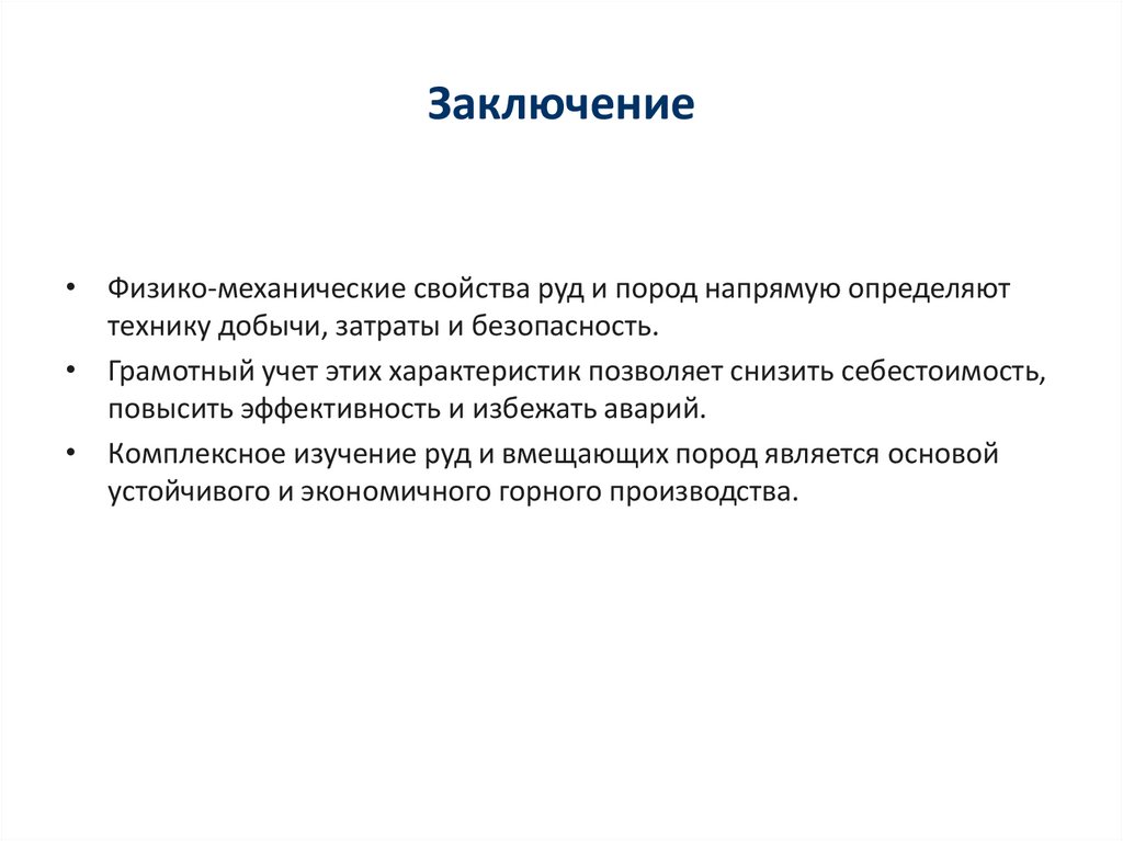 Заключение• Физико-механические свойства руд и пород напрямую определяют