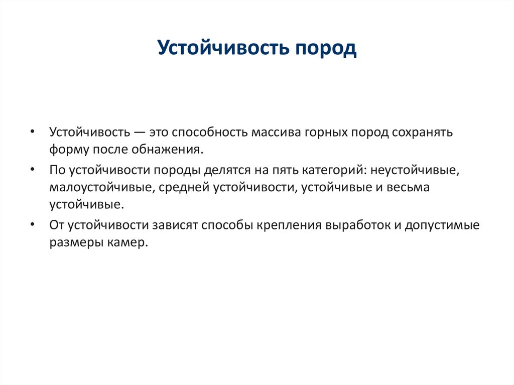 Устойчивость пород• Устойчивость — это способность массива горных пород сохранять