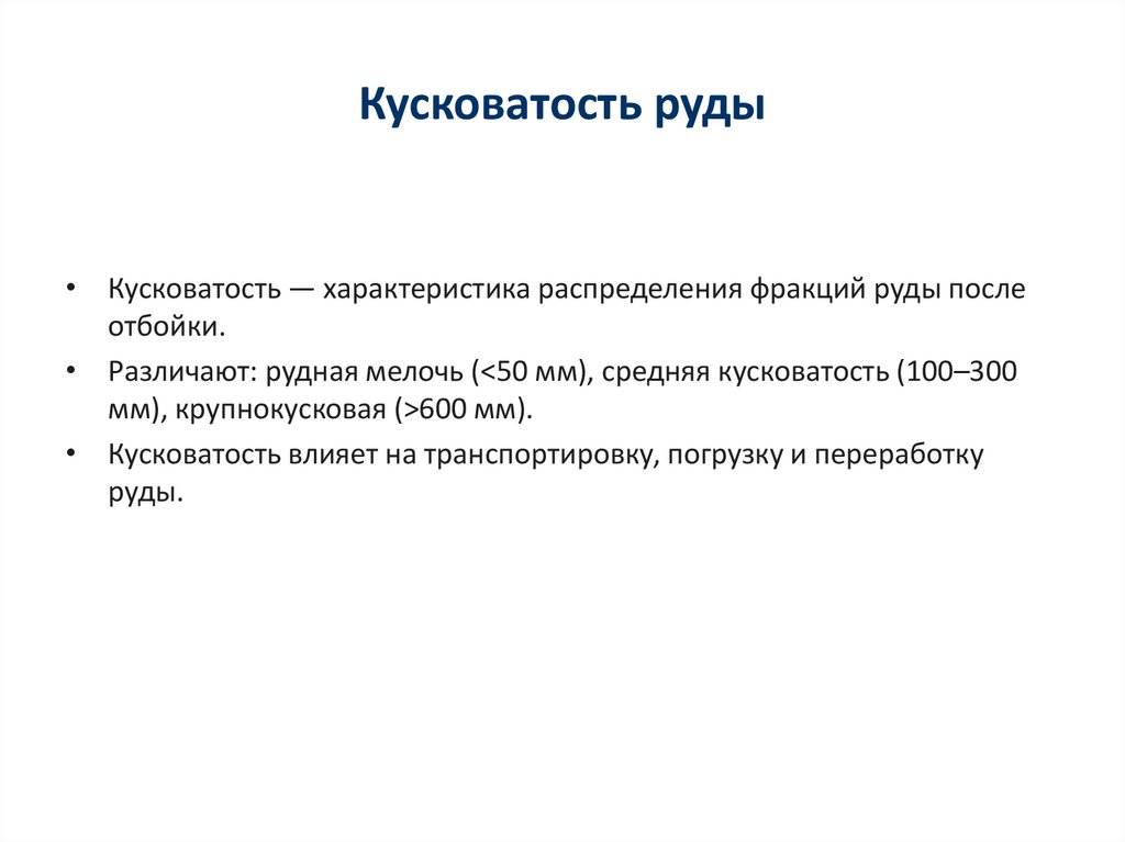 • Различают: рудная мелочь (<50 мм), средняя кусковатость (100–300
