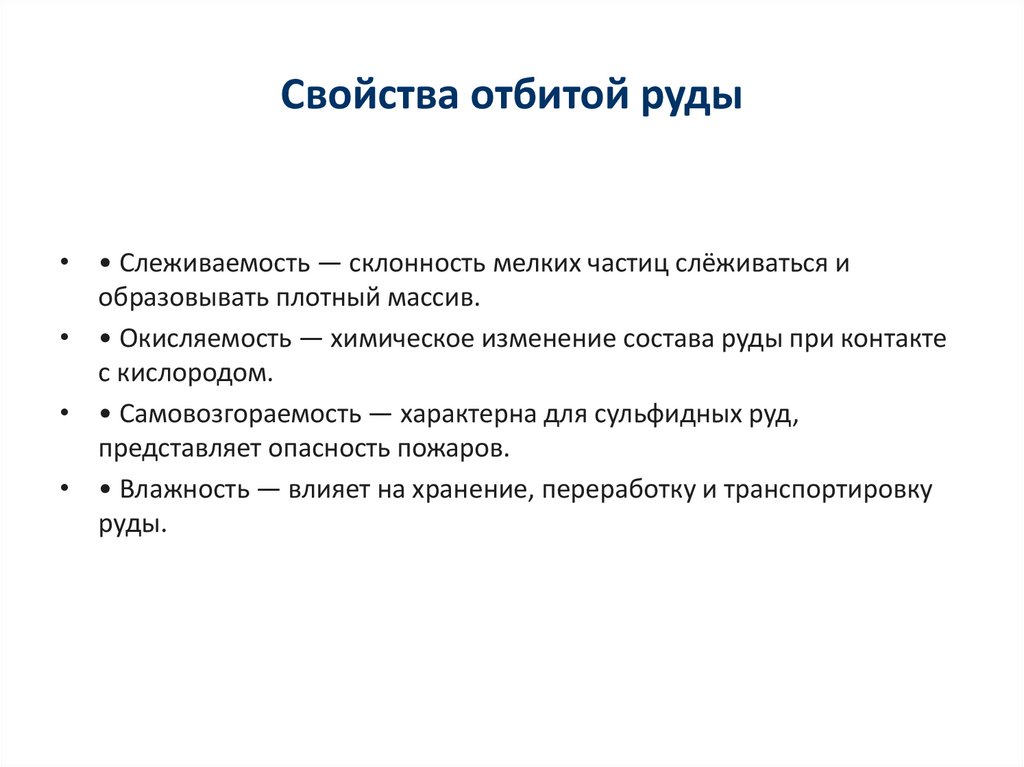 Свойства отбитой руды• • Слеживаемость — склонность мелких частиц слёживаться и