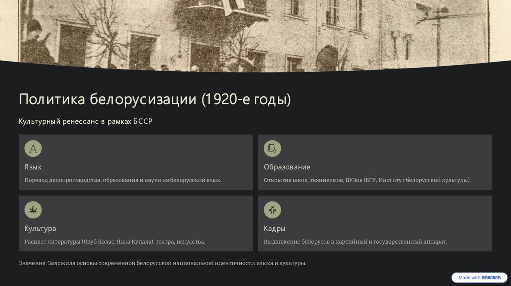 Открытие школ, техникумов, ВУЗов (БГУ, Институт белорусской культуры).