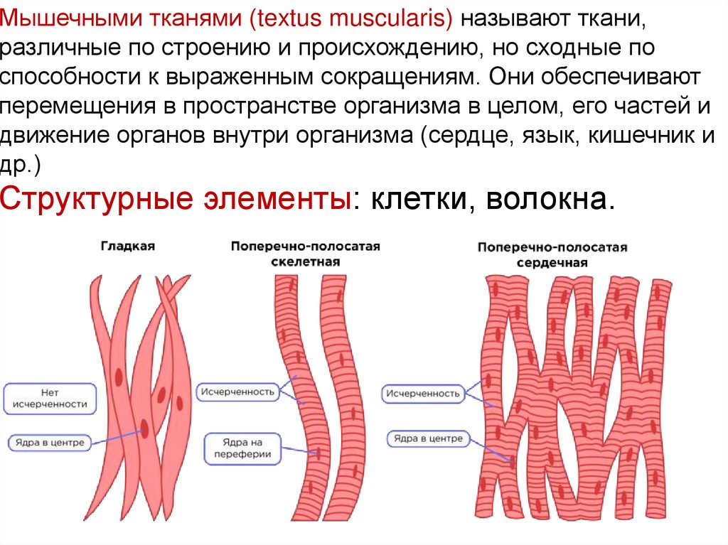 Мышечными тканями (textus muscularis) называют ткани,различные по строению и происхождению, но сходные по
