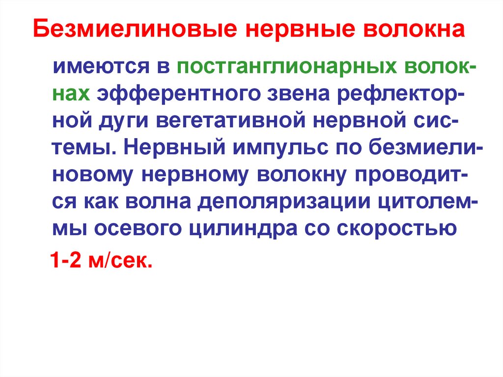 Безмиелиновые нервные волокнаимеются в постганглионарных волокнах эфферентного звена рефлекторной дуги вегетативной нервной системы. Нервный импульс по безмиелиновому нервному волокну проводится как волна деполяризации цитолеммы осевого цилиндра со скоростью