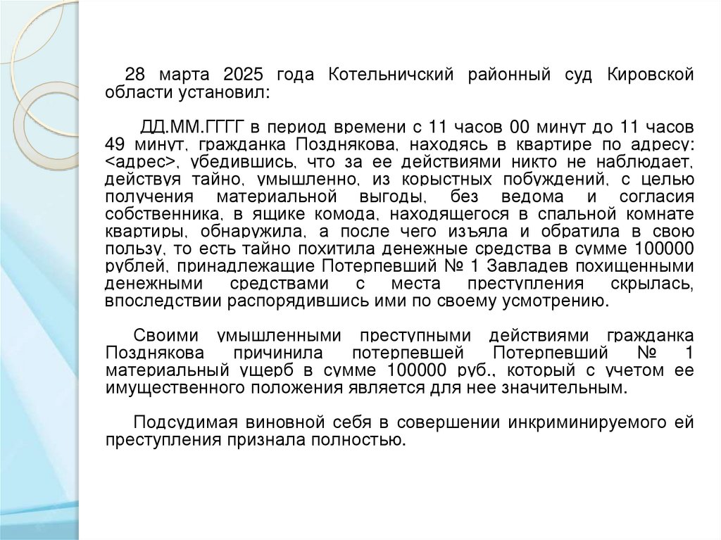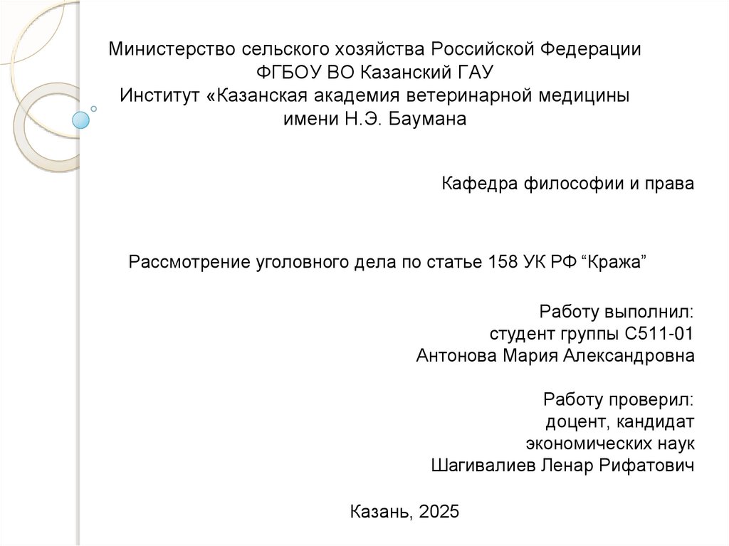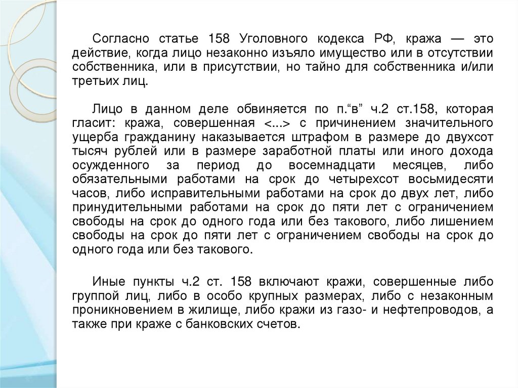 Рассмотрение уголовного дела по статье 158 УК РФ “Кража”