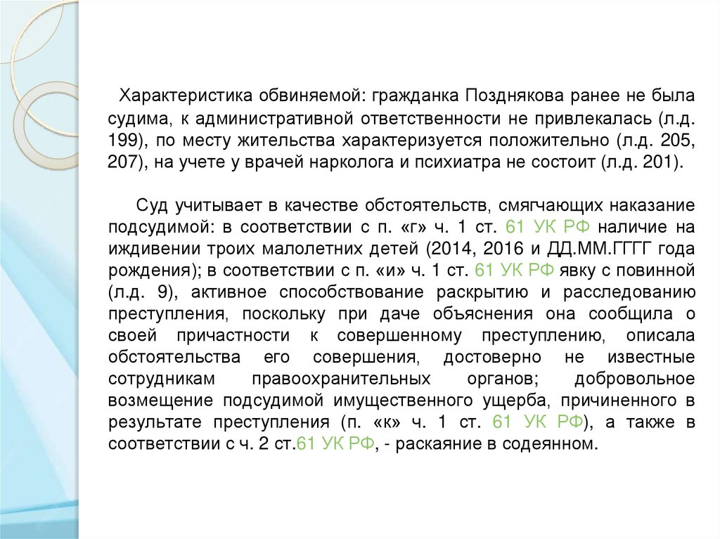 Характеристика обвиняемой: гражданка Позднякова ранее не быласудима, к административной ответственности не привлекалась (л.д.