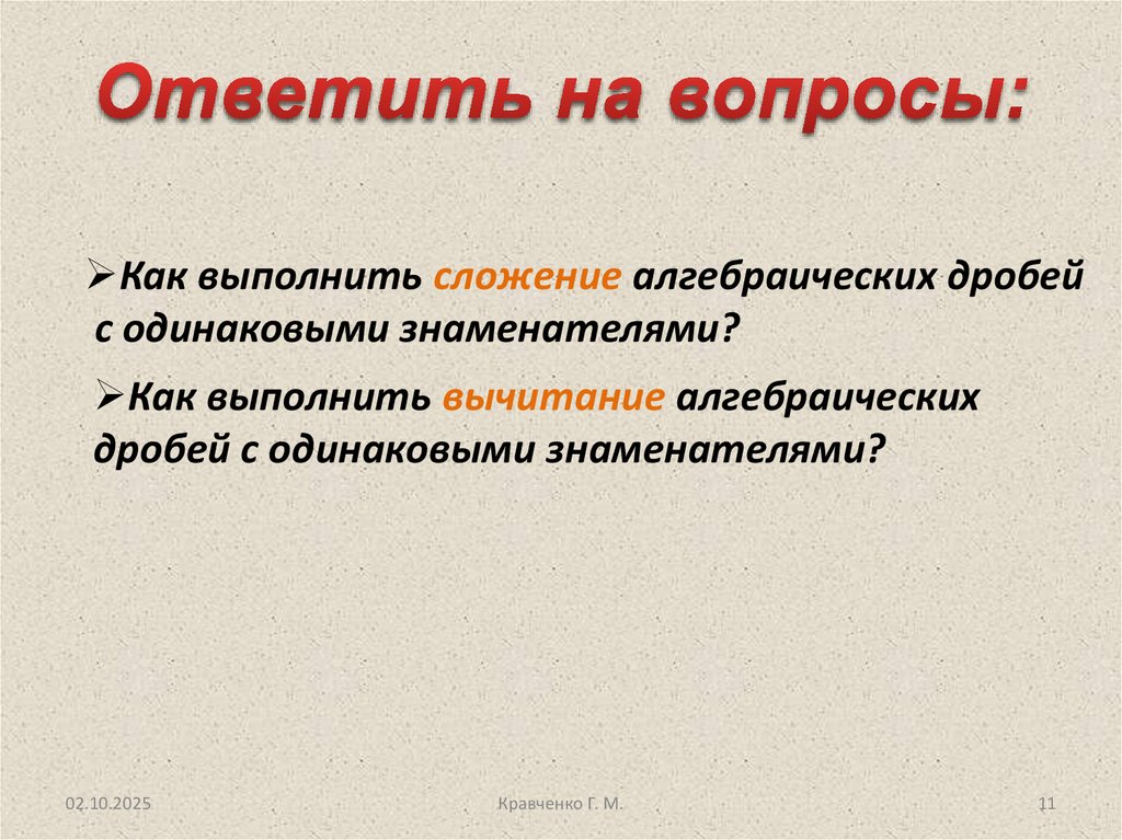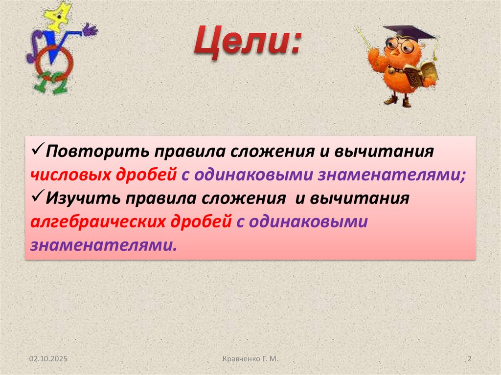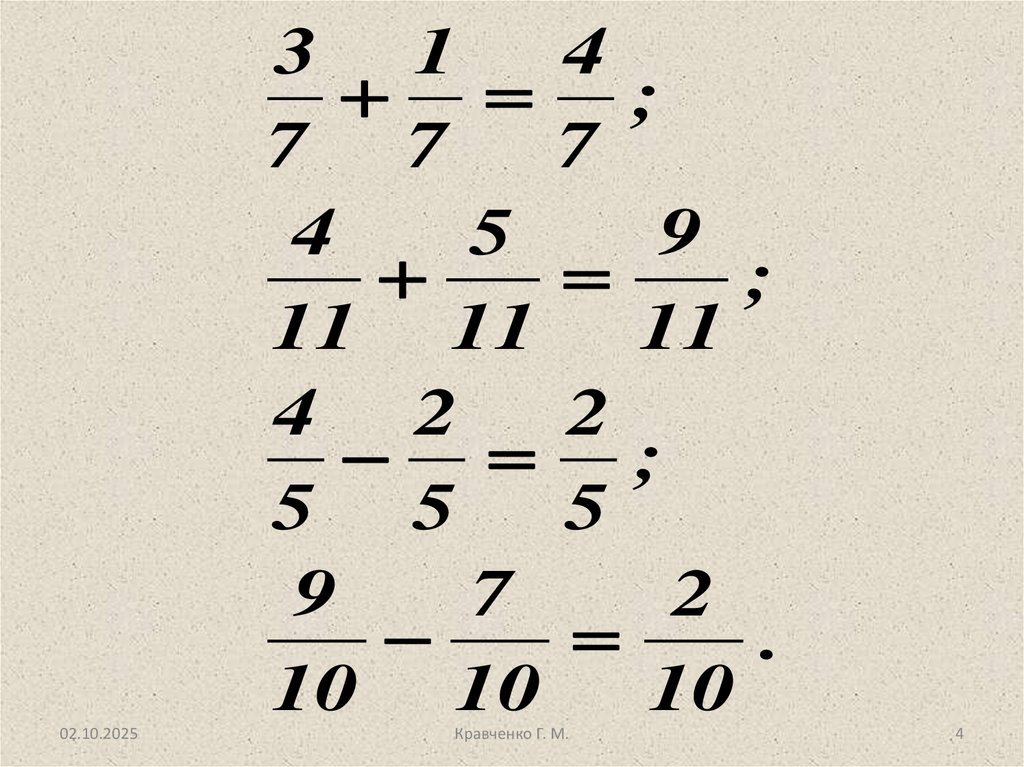 Повторить правила сложения и вычитаниячисловых дробей с одинаковыми знаменателями;