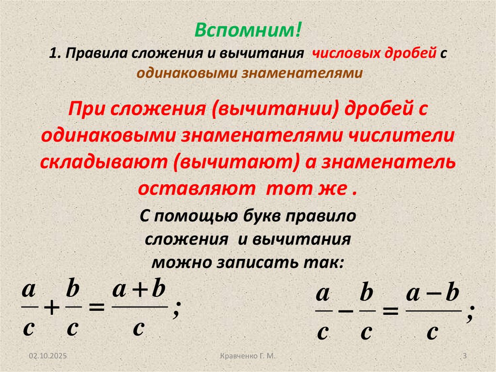 Вспомним!1. Правила сложения и вычитания числовых дробей с