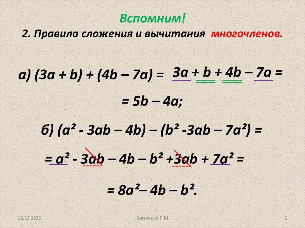 Вспомним!2. Правила сложения и вычитания многочленов.