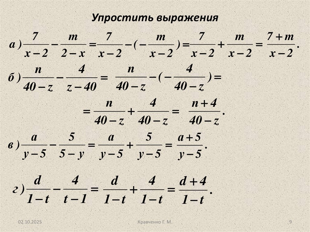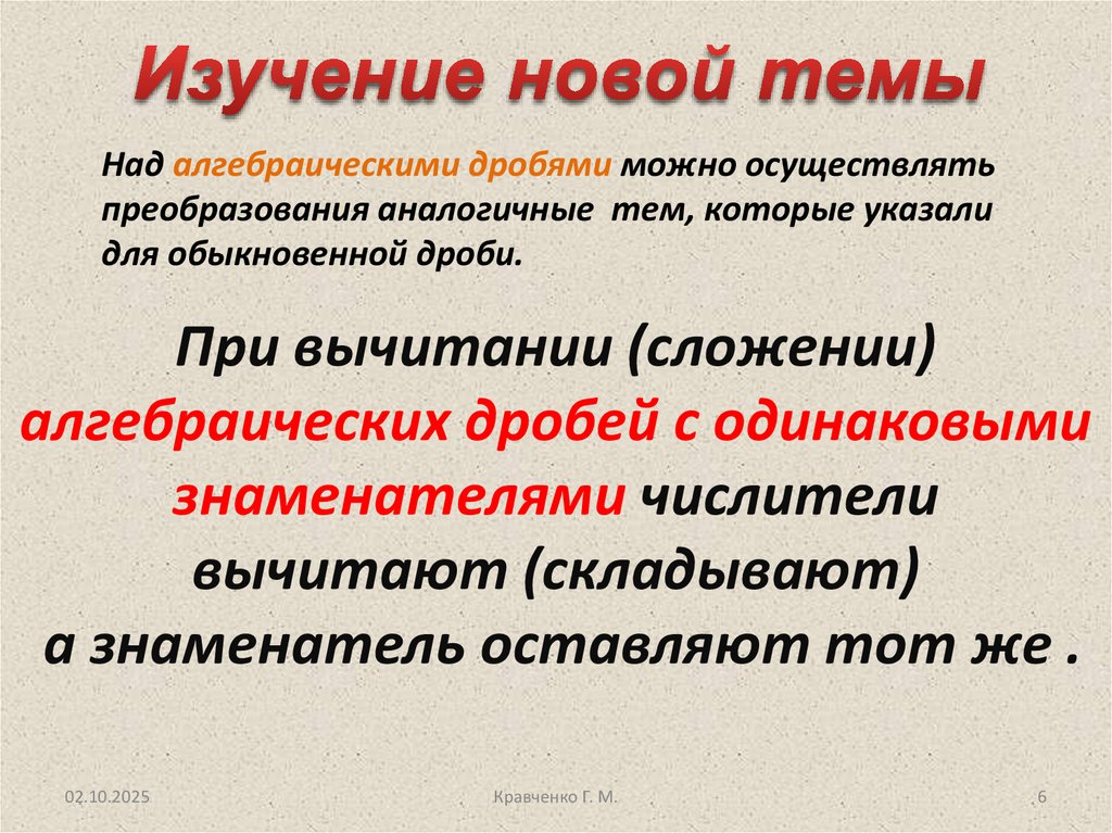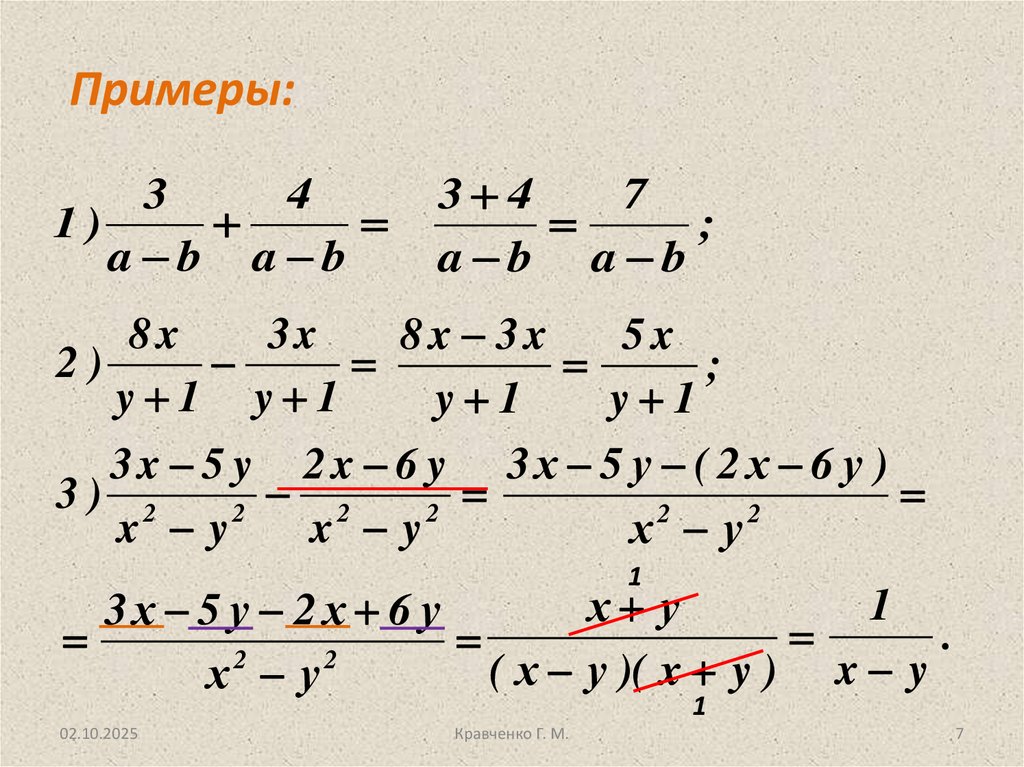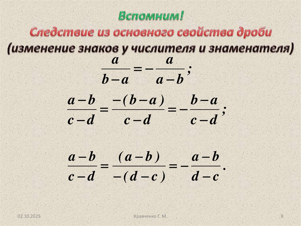 Над алгебраическими дробями можно осуществлятьпреобразования аналогичные тем, которые указали