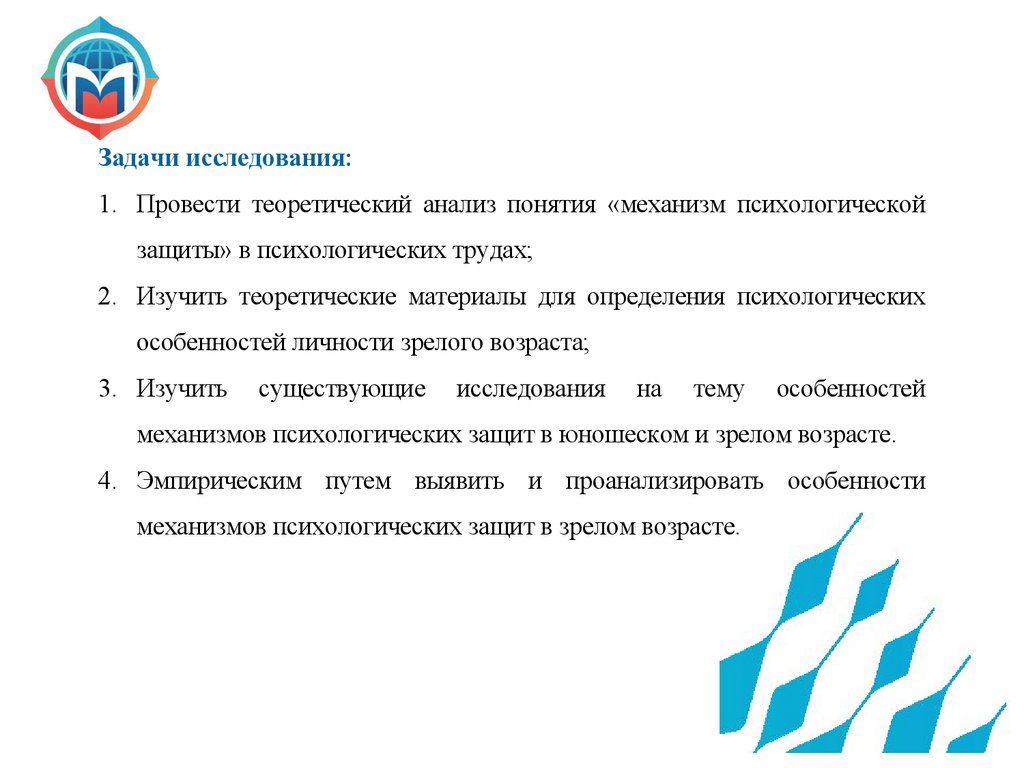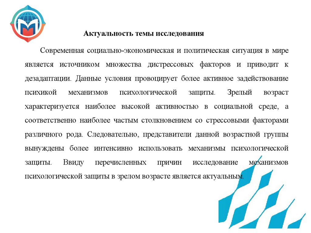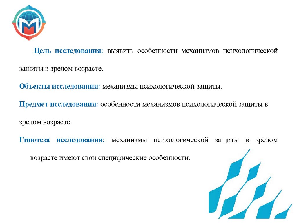 Гипотеза исследования: механизмы психологической защиты в зрелом