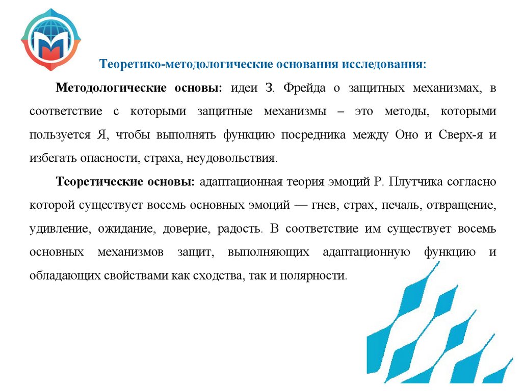 Теоретико-методологические основания исследования:Методологические основы: идеи З. Фрейда о защитных механизмах, в