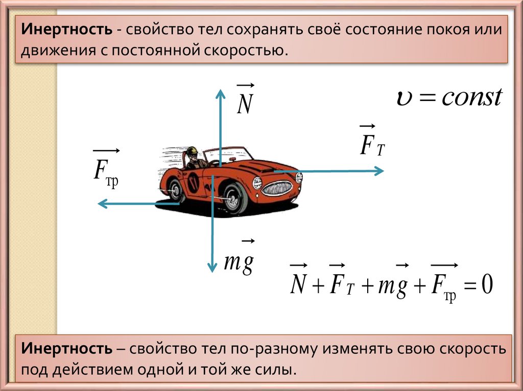 Инертность - свойство тел сохранять своё состояние покоя илидвижения с постоянной скоростью.