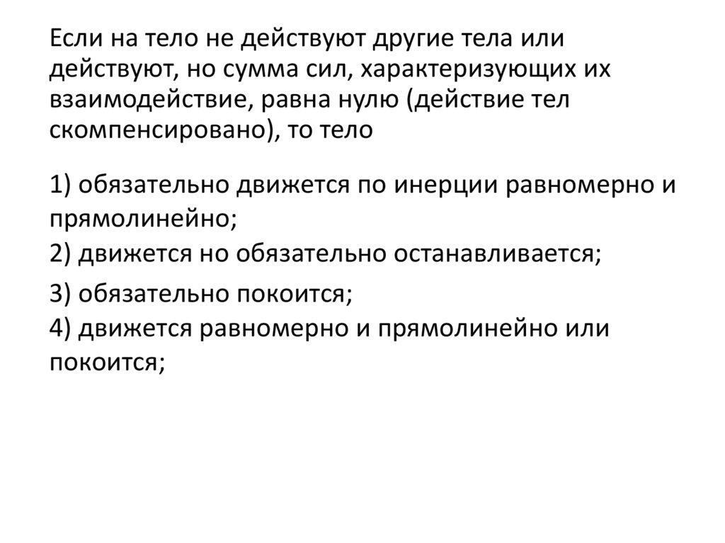 Если на тело не действуют другие тела илидействуют, но сумма сил, характеризующих их